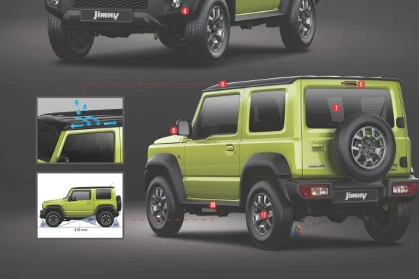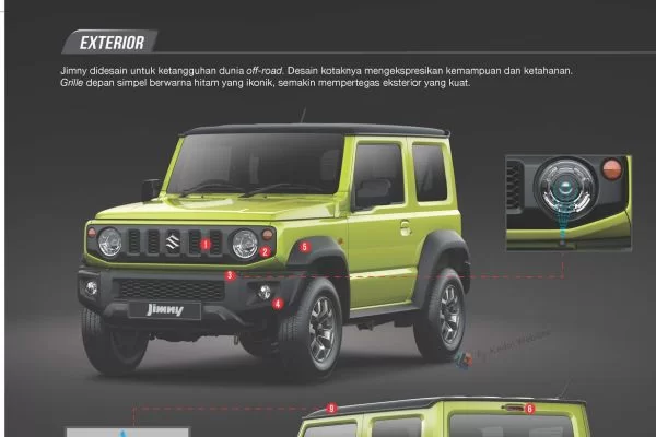 Kesan retro masih sangat terjaga dengan lampu depan bentuk bulat seperti pendahulunya, meski sudah memakai LED. Lampu sein dan lampu kabutnya juga bulat, meski dengan ukuran lebih kecil. Beralih ke samping, desain Suzuki Jimny terasa simpel, namun sangat berkarakter. Overfender plastik solid memberi kesan tangguh dan gahar dari SUV mungil ini.